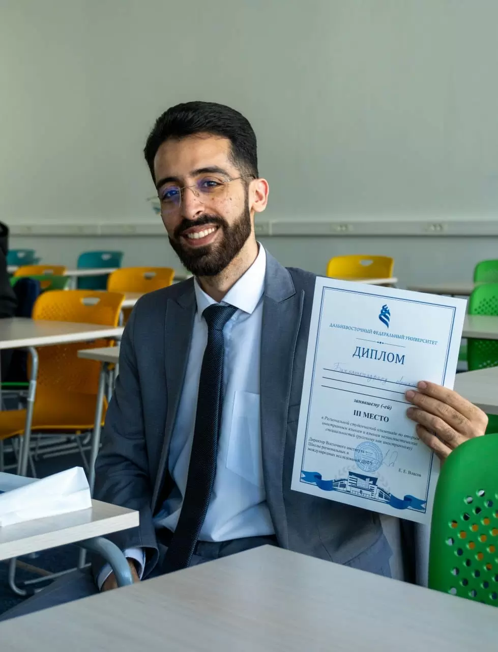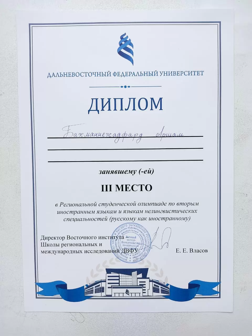 Старший преподаватель кафедры русского языка Елена Пугачёва подготовила к участию в конкурсе студента из Ирана Аршама Бахманнежадфарда (группа БЛГ-22-РЯ1и), который занял 3 место в Региональной студенческой олимпиаде по вторым иностранным языкам нелингвистических специальностей (русскому как иностранному), проводимой Школой региональных и международных исследований ДВФУ.