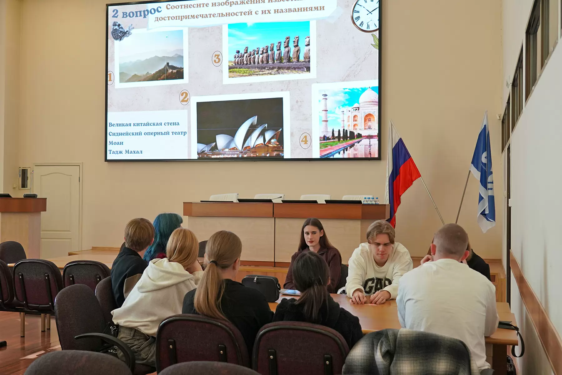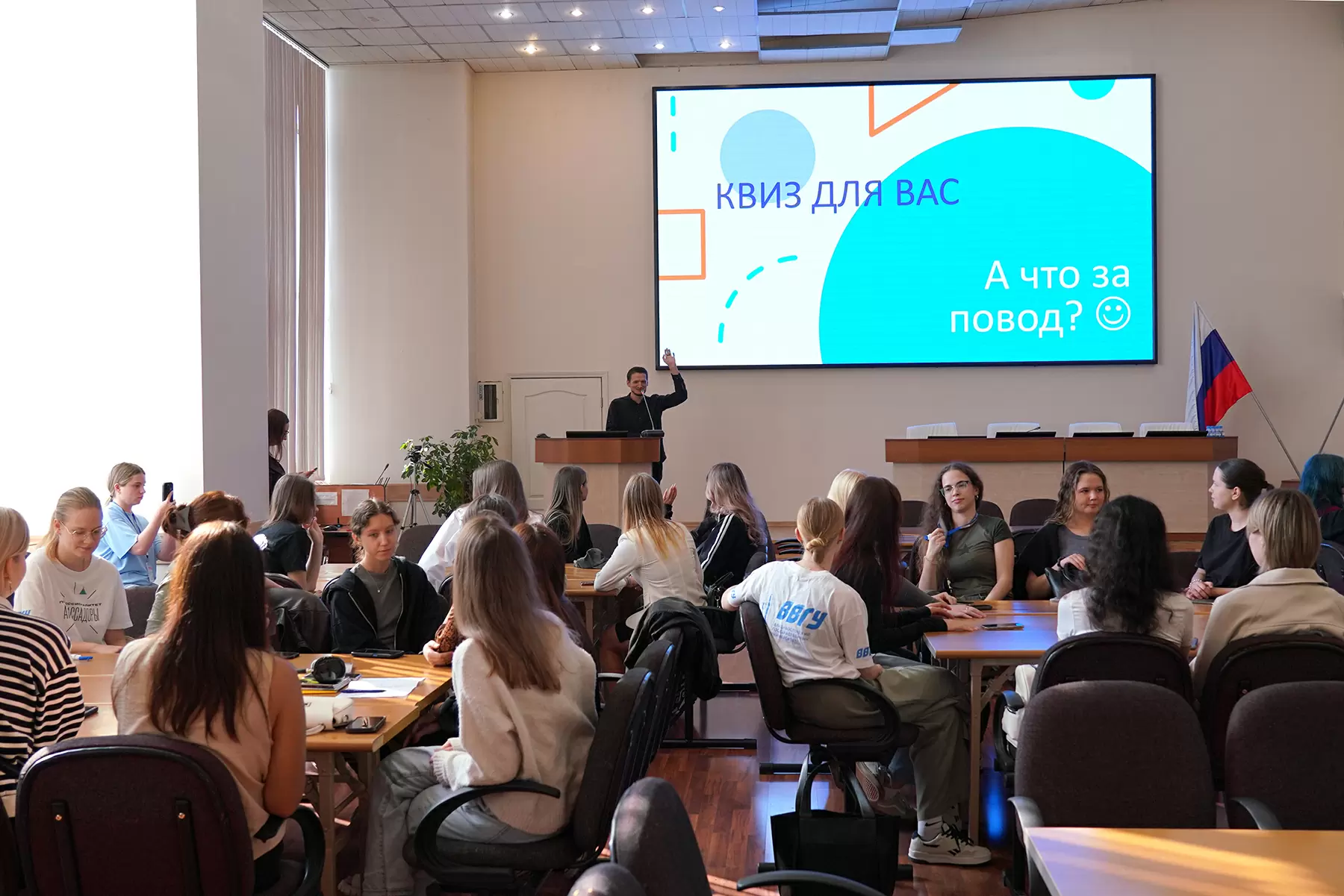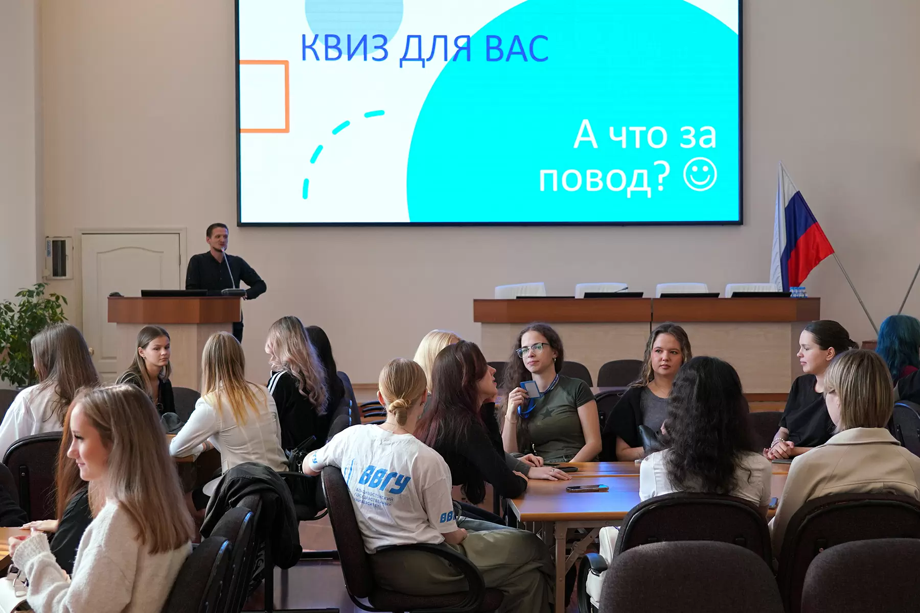 «Я рад вас всех здесь приветствовать, коллеги! У нас есть замечательная традиция – каждый год в День туризма мы с ребятами-первокурсниками проводим праздничный квиз. Радует, что он всегда собирает такое широкое внимание вас – студентов», – открыл квиз Артём Кононов, доцент кафедры туризма и гостинично-ресторанного бизнеса ВВГУ.